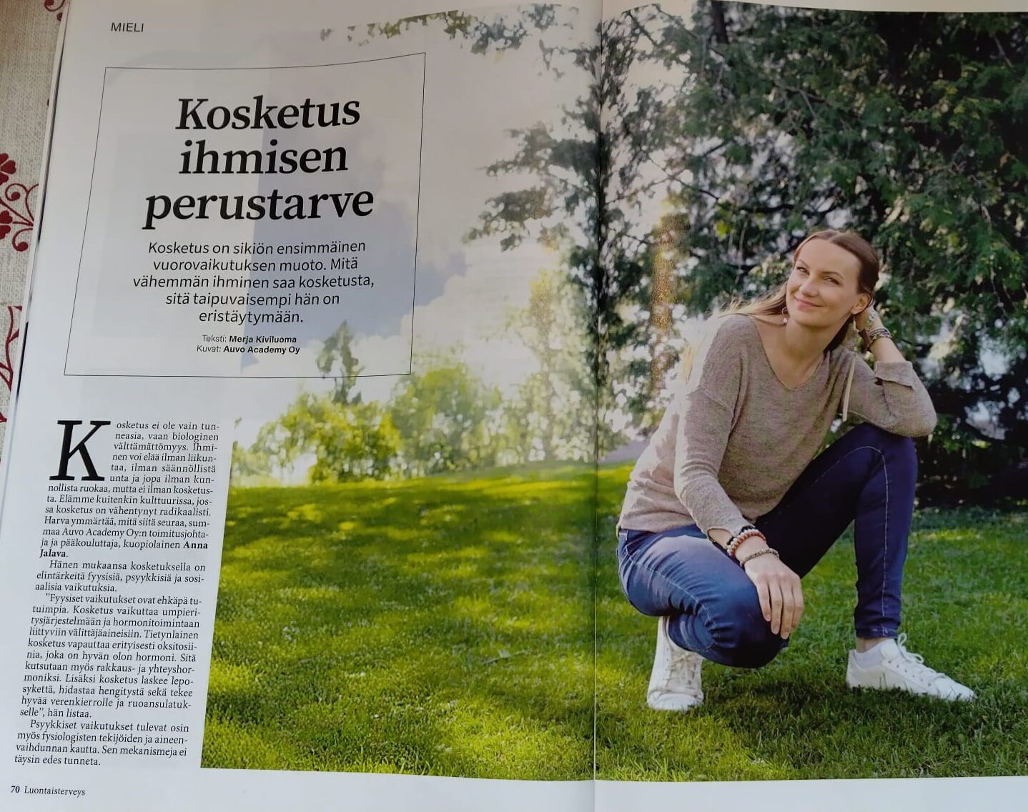 Anna Jalavaa haastateltiin Luontaisterveys-lehteen kosketuksen merkityksestä ihmisen hyvinvoinnille. Artikkelissa käsitellään kosketuksen biologista ja psyykkistä vaikutusta sekä sitä, miksi kosketus on erityisen tärkeää nykypäivän kosketusköyhässä kulttuurissa.