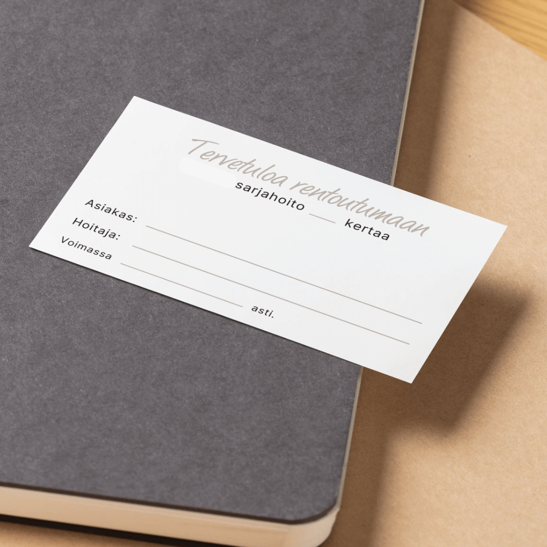 • Voit itse valita miten monta hoitoa myyt sarjakortille, esim. kolme tai viisi. Kortissa on tyhjää tilaa päivämäärämerkinnöille.